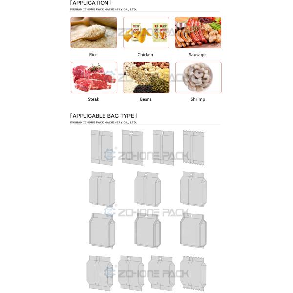 The automatic pouches feeding vacuum packing machine is suitable for bag types: aluminum foil bags, four-side sealing bags, paper bags and other composite bags.